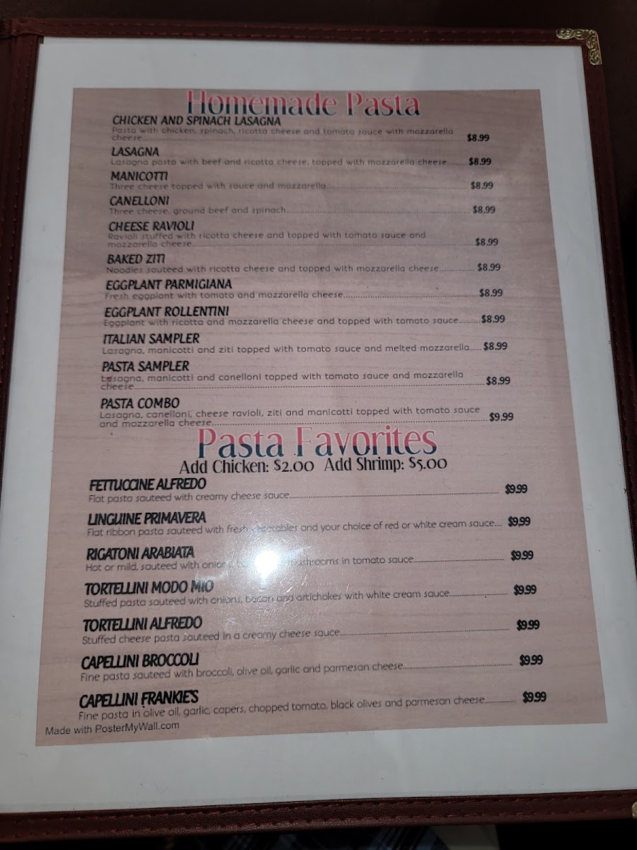 If you’re craving something hearty and comforting, the Frankie's Pasta & Pizza Menu is exactly where your appetite should land. Tucked along 602 N Dr M.L.K. Jr. Hwy in Mexia, TX, this spot serves up the kind of dishes that instantly feel familiar-in the best way possible. The pizzas come loaded with gooey cheese and perfectly baked crusts, while the pasta plates arrive rich, saucy, and generously portioned.